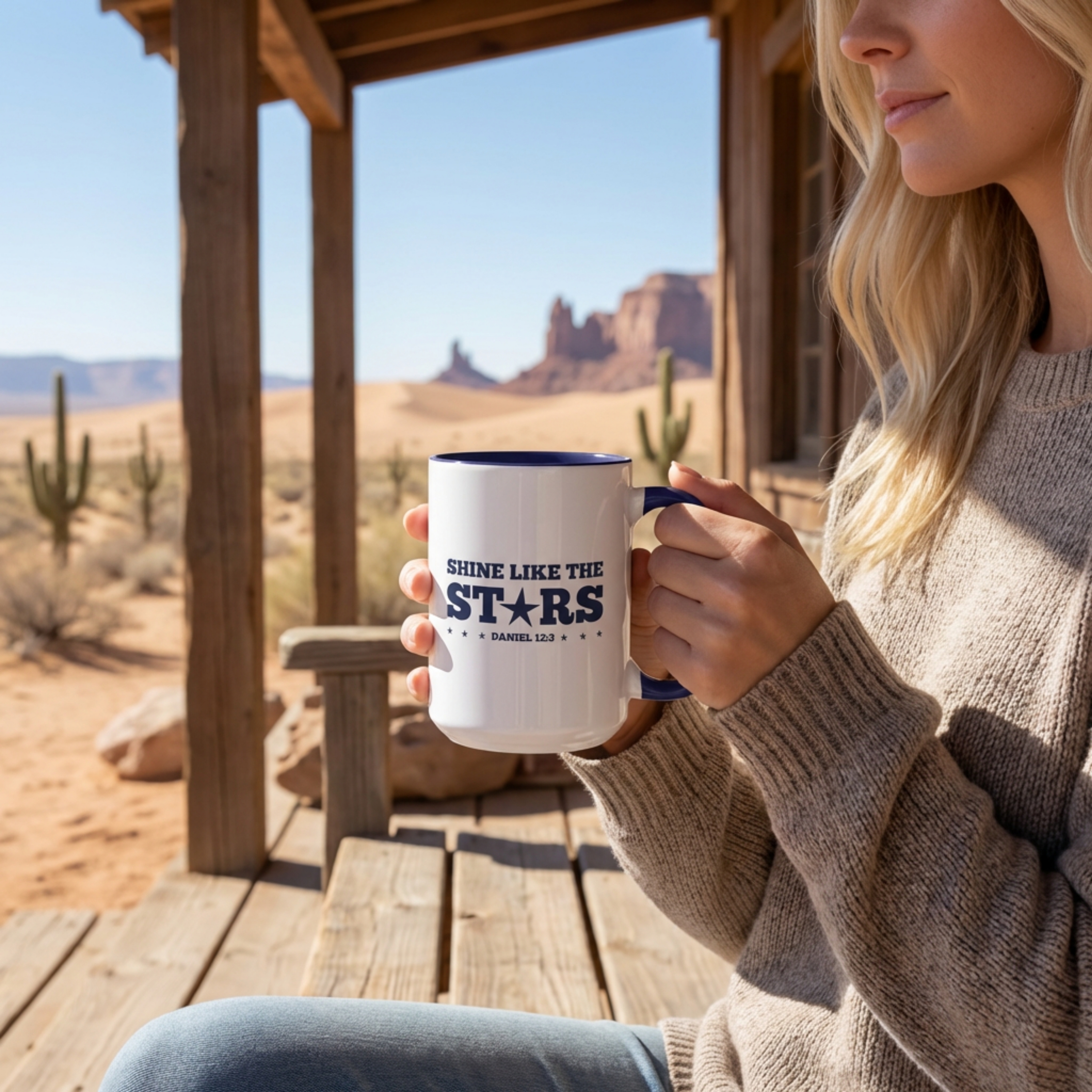Warm morning light falls across a simple, confident mug that speaks softly of steady hope. This ceramic mug pairs a clean white exterior with a bold, colored interior and handle, framing the phrase “SHINE LIKE THE STARS — Daniel 12:3” in vintage-inspired type. It feels like a quiet ritual: pour your coffee or tea, hold the C-shaped handle, read the reminder, and move into the day with calm purpose. The glossy finish and sharp print let the message pop while the contrasting color adds personality to your kitchen shelf or office desk. Durable enough for daily use, it becomes that small, steady anchor in a routine: a brief moment to breathe, reflect, and carry light into ordinary hours.