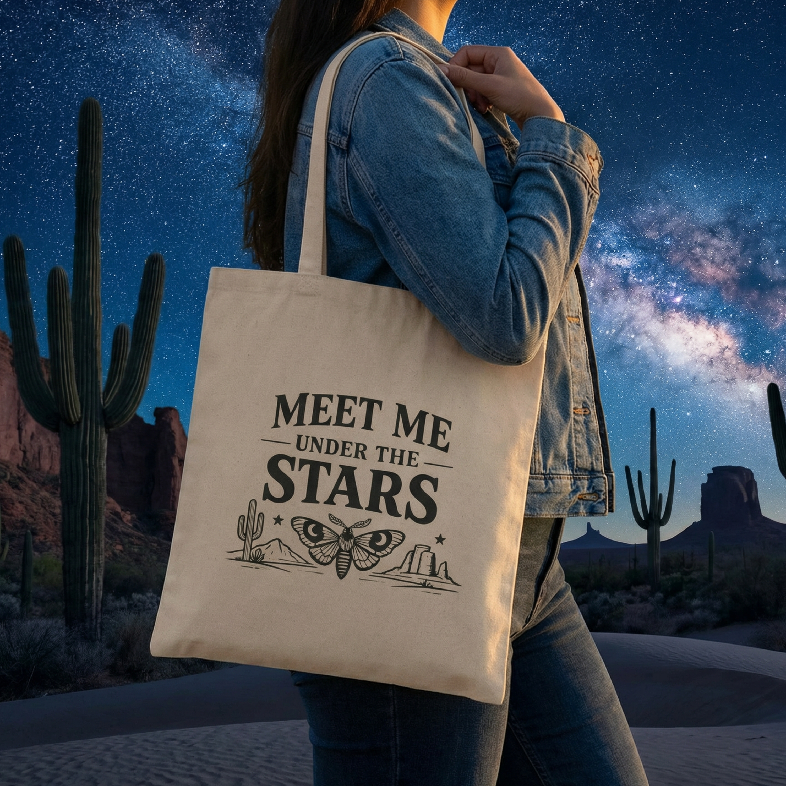 This sturdy cotton canvas tote brings a whisper of desert nights to everyday errands. The natural heavy-weave fabric holds its shape and weight — a roomy, flat-cornered silhouette that wears well over the shoulder. A small, hand-drawn line-art scene and the words “Meet Me Under The Stars” sit centered on the front, evoking warm evenings, moths drawn to porchlight, and slow drives out past city limits. It’s the kind of bag you grab for farmers’ markets, library runs, and late-night drives with the windows down. The reinforced self-fabric handles stand up to repeated use, and the sewn-in label and substantial canvas give a quality feel that ages nicely.