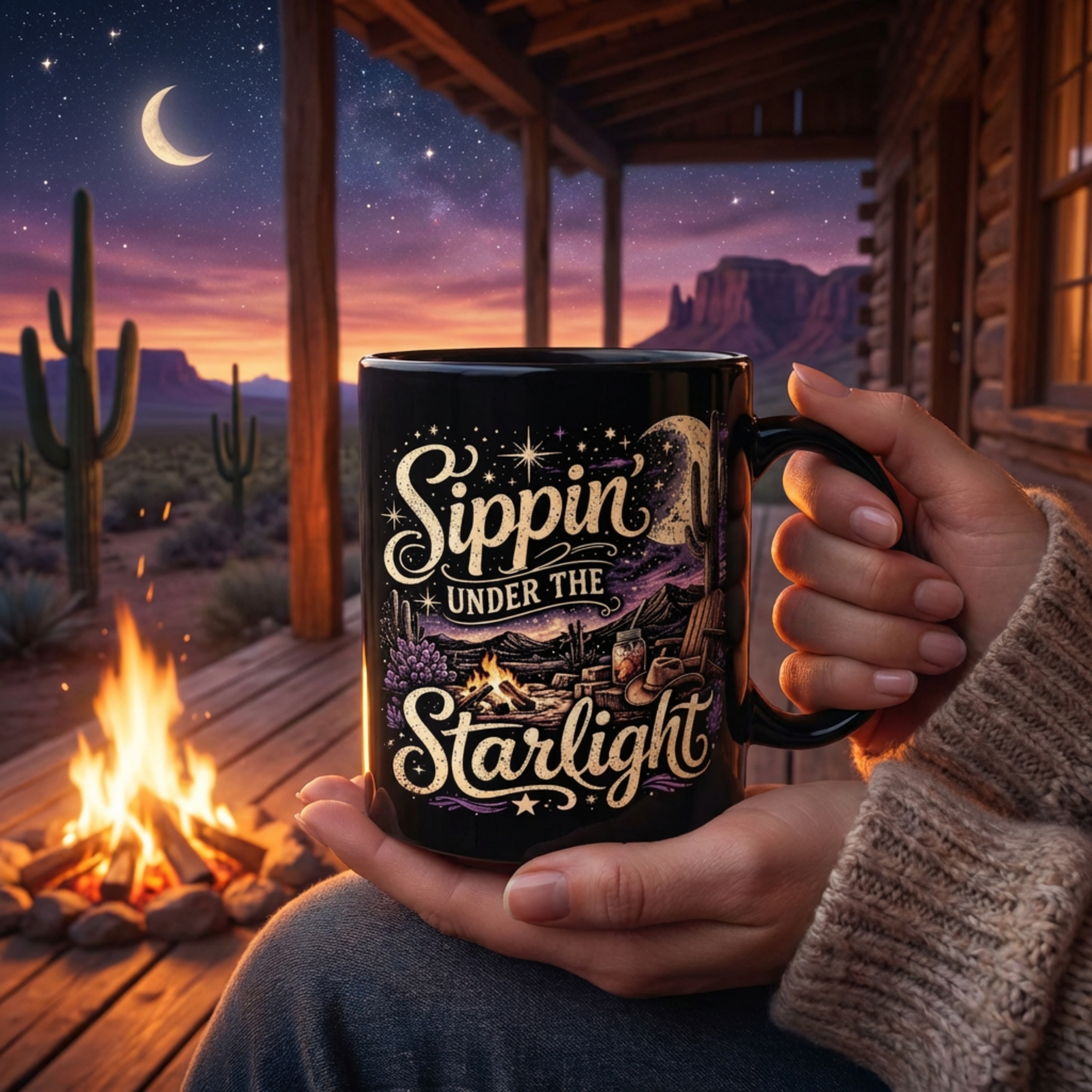 A glossy black ceramic mug printed with a cozy nighttime desert illustration and hand-lettered phrase “Sippin’ under the Starlight.” Warm cream, purple, and sandy tones pop against the deep black glaze, drawing the eye to a scene of two chairs, a small fire, and a wide star-filled sky. The artwork carries a relaxed, slow-evening vibe — the kind of mug that feels like a soft blanket for your hands. Use it for morning coffee, late-night tea, or quiet moments on the porch. Dishwasher- and microwave-safe, it holds 11oz of your favorite coffee or tea and features a comfortable C-shaped handle for an easy grip.
